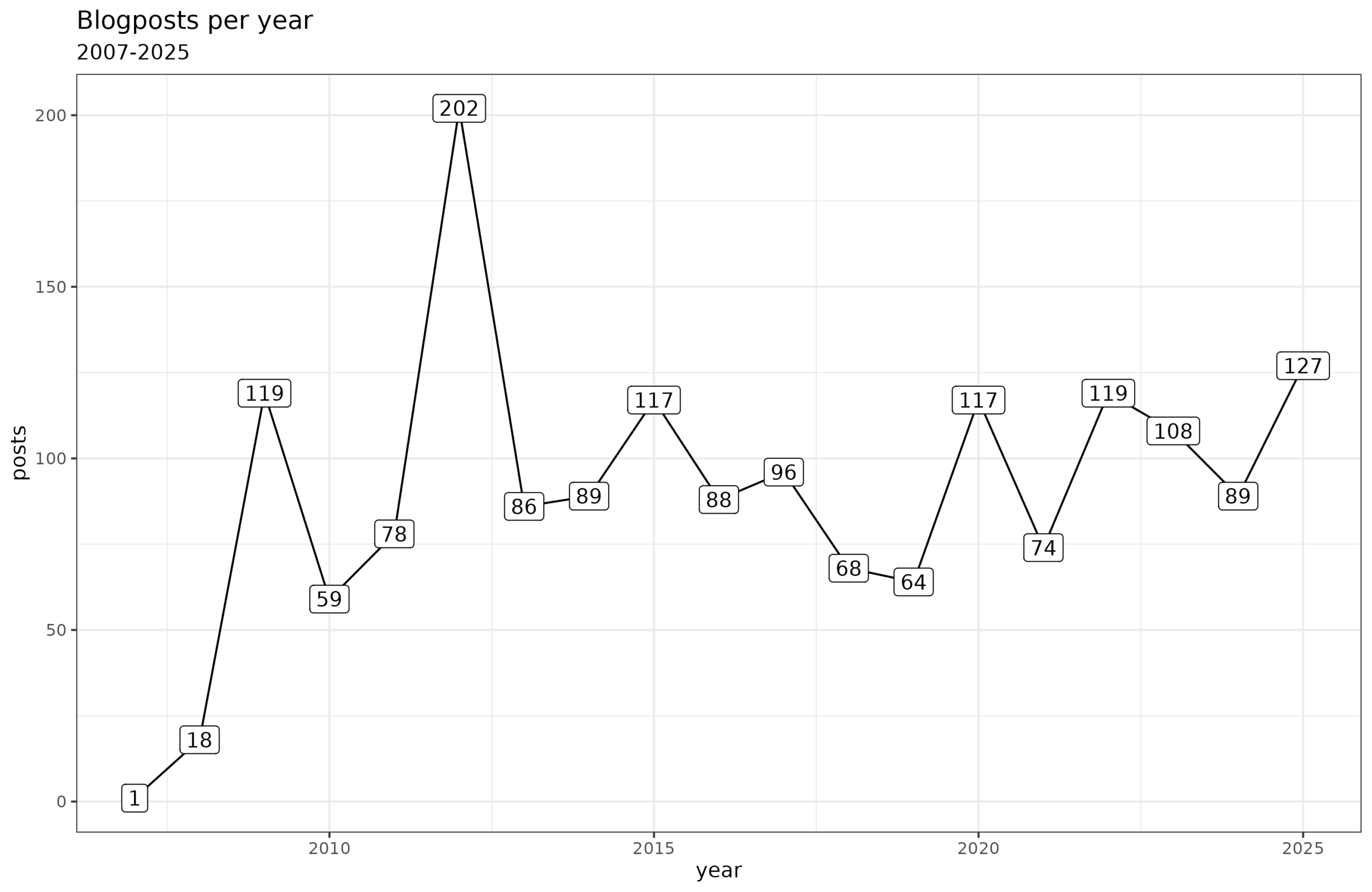 Here we can probably also see where the extra blogposts were coming from. I published a bit fewer papers this year. So maybe some of the effort was directed towards blogposting rather than the more time-consuming academic writing. On the other hand, I also spend an increasing amount of time supervising research by others, as well as being involved in a number of other projects.