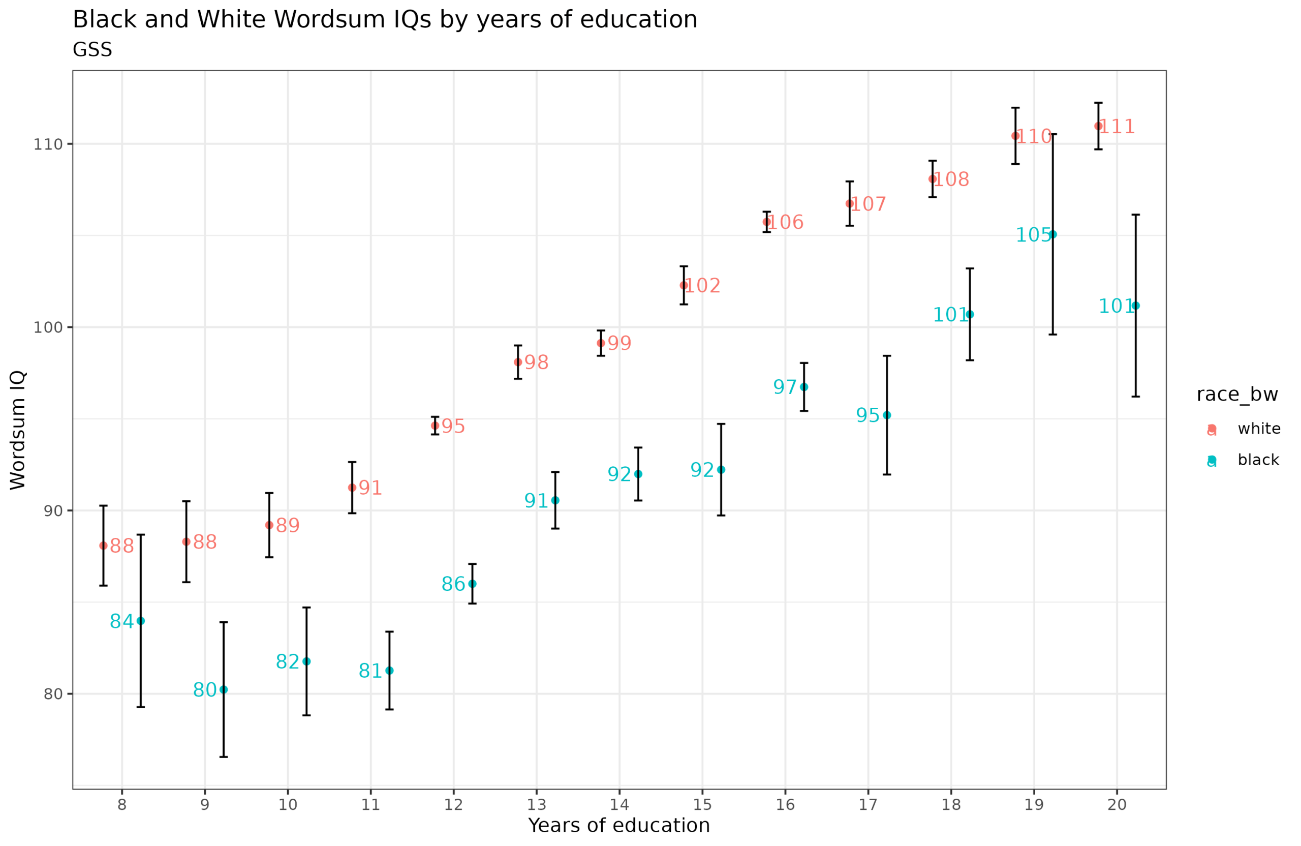 Recall that this is a 10 item test, so it isn’t great. The overall gap is 10.4 IQ (White norms), and controlling for education, it is 8.3 IQ (this is the average distance between the red and turquoise points, weighted by the number of people). Statistically, one year of education is associated with 2.2 IQ, which means that for the IQs to match, Blacks would need about 5 more years of education (you can see this by comparing the Black mean for 18-20 years vs. White 14 years, both of which have means of ~102 IQ). Clearly, then, holding e.g. degree constant as done in audit studies is not sufficient and employers have reasonably statistical grounds for preferring Whites over Blacks given identical years of education.