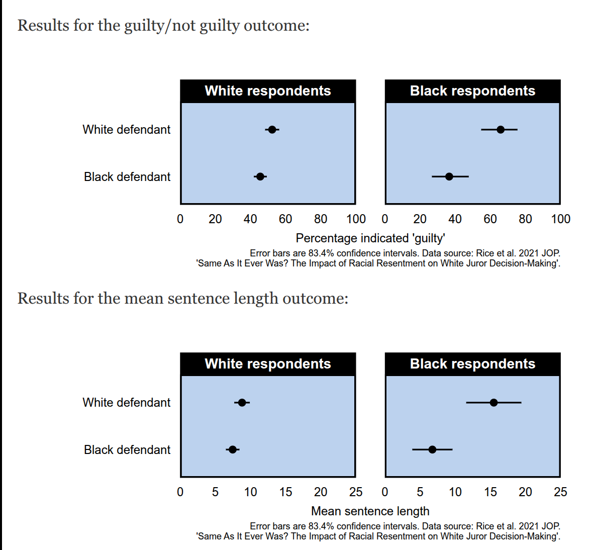1.3%point sounds rather trivial. Not mentioned by Jussim are mock jury trials. They give results like these: