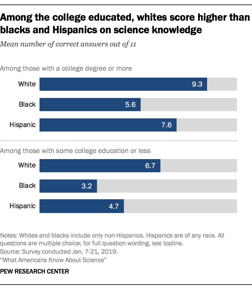 The problem here is the same as in my last blogpost (Whose benefit of the doubt?). If groups differ in some hard to measure characteristics, and all you know about them is the CV, a noisy measure, then it is rational to prefer the person from the higher achieving group given identical CVs (‘individuating information’ in Jussim’s terminology). We can illustrate this by using educational attainment and IQ scores. Pew Research has this result concerning science knowledge: