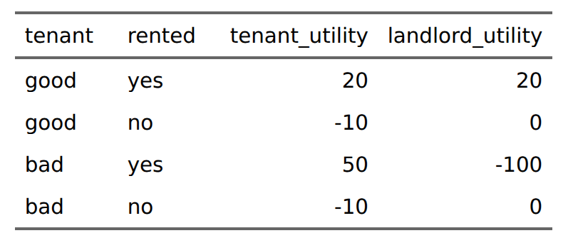 In this situation, there are no costs to anyone explicitly calculated, perhaps because everybody who applied to become a pilot but didn’t make the cut found another job afterwards. However, in many real life situations, there are costs, and they may be large. Suppose you are a landlord, and you are looking at possible tenants, some of them green, some of them blue. You don’t have the luxury of giving them some detailed assessment, you can only make a guess based on what you could glance from their online profiles and the impression they gave you on the phone. Let’s say there are secretly 2 kinds of tenants, good and bad ones. Whether a given tenant is good or bad depends again on the trait level (say, well-behavedness). Those below a score of -2 are always bad and those above are all good. As a landlord, if you pick a bad tenant, they wreck your apartment, steal your furniture, fail to pay rent, and refuse to evict. This gives you a benefit of -100 utility. A good tenant gives you 20. From the tenant’s perspective, if they are good, they also gain 20 from cooperating with you (even trade!), while a bad tenant gains 50 utils (they have fun wrecking your stuff, not paying rent, and they make money selling your furniture). Note the asymmetry here: it is easier to destroy value than create it, and the total utility of a bad tenant is -50 (50-100), or -150 if you consider the ill-gotten fails should be calculated negatively. If you don’t rent them a place to live, both good and bad tenants suffer a -10 utility from being homeless and have to live with friends and family for a while. Thus, we have the following game theory matrix: