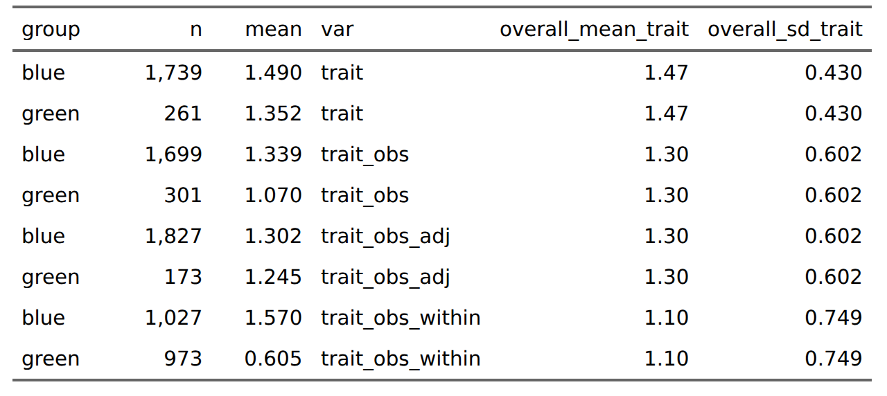 The different methods maximize different things. Selecting for the actual trait value will maximize the mean trait level of the selected persons, of course, and produce the smallest variation among the selected (sd = 0.43). Using the observed scores results in a moderate gap in trait level among those selected (1.33 vs. 1.07). Using the estimated true scores, this gap is shrunk (1.30 vs. 1.25) but fewer greens are selected (173 vs. 301). Finally, using within-group norms results in the lowest average trait level of the selected candidates (1.10 vs. 1.30) and the largest variation in trait level among candidates (sd = 0.75), as well as a sizable gap in trait level between the groups among the selected (1.57 vs. 0.61). As such, we cannot both maximize the overall trait level while minimizing the various gaps and equalizing the number of persons selected. If we say the benefit of being selected is an arbitrary unit of 1, we can calculate the benefits to the group members by the counts. In reality, there would be secondary effects downstream of the different mean trait levels in the selected group. If it represents pilots, for instance, more people will die in plane crashes if within-group norms are used, and the ability differences between green and blue pilots will be noticeable to the pilots themselves. It also recreates the problem for the next stage of selection, say, promotion, where the same group gap between the greens and blues exist (gap size post-selection is 0.97).