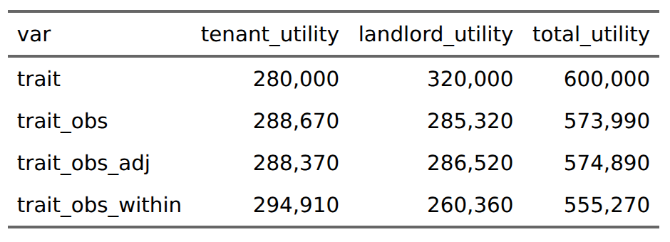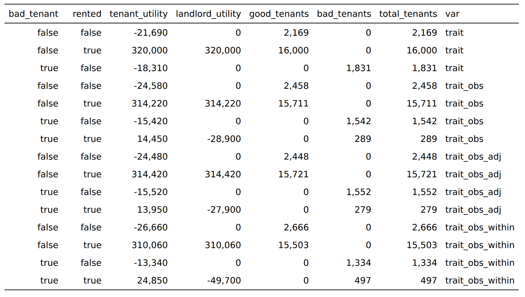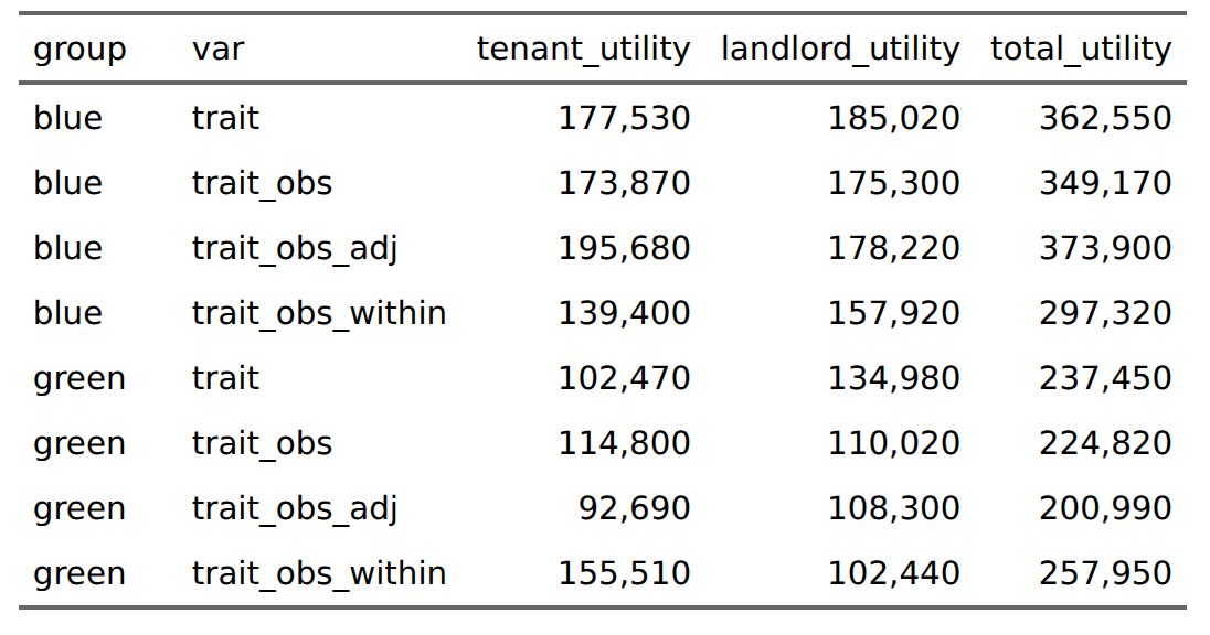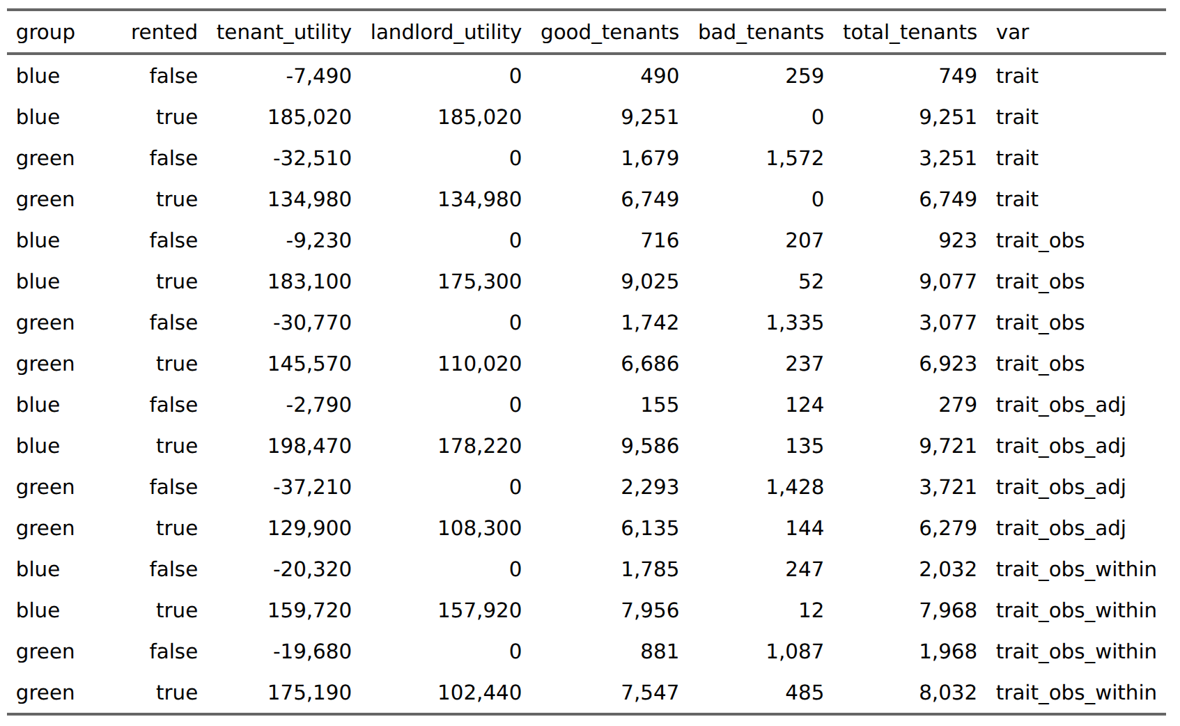 For the blues, the preferred situation is using the adjusted scores (196k), which are biased a bit in their favor. Otherwise, regular selection is best (174k). For the greens, however, they much prefer within-group norms (156k) to observed trait levels (115k). The tricky part here is that some of the utility gains by greens in this scenario goes to the bad tenants. We can see this by computing the sums by tenant type and renting status:
