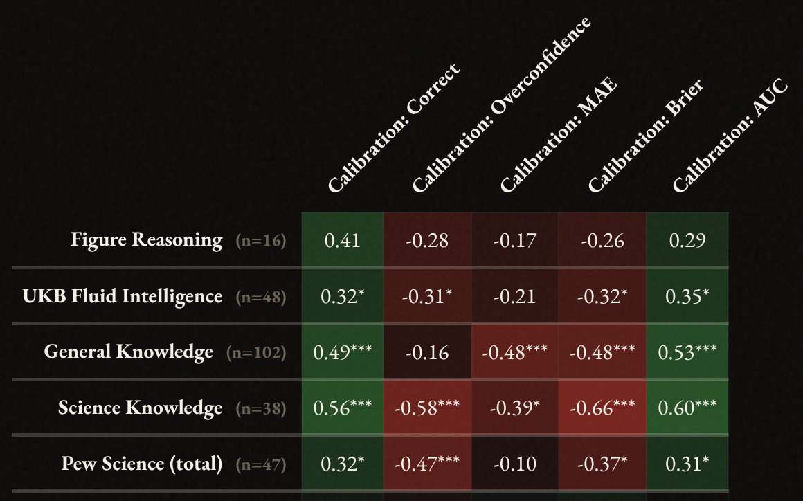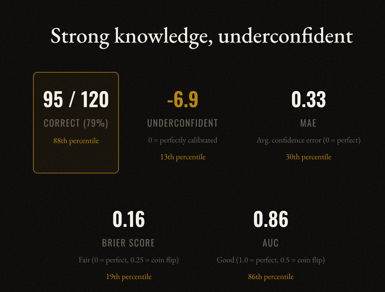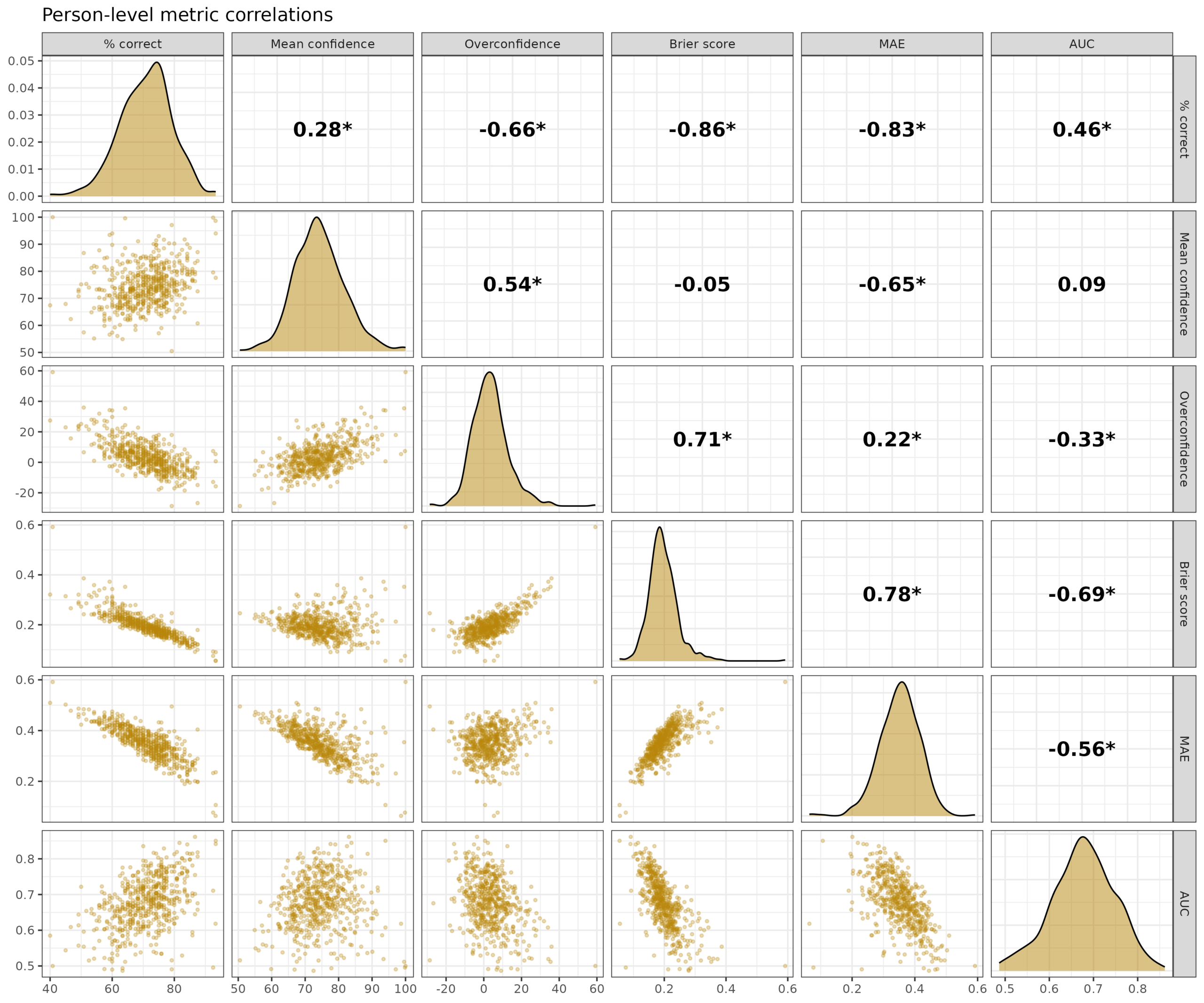 Most of them have at least decent correlations with each other but have different meanings. For instance, you could answer every question correctly with 50% confidence, and you will get 100% correct, but a bad score on the others. For interpretation, overconfidence is tricky because 0 is the best value, so in theory it should have nonlinear U shaped relationships to others, but it doesn’t. It is also mathematically impossible to be overconfident if you get everything correct, which necessitates a negative overconfidence score unless you answered 100% confidence to every question.