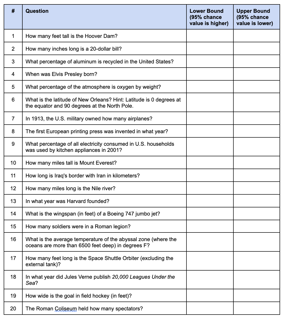 The content of the questions doesn’t matter too much, and most of these tests use trivia questions, but you can in principle use anything. There’s one based on US trivia/geography here, and another US trivia one here. There’s 2 main formats, the one using true/false and input confidence level format, and the one where you input your numerical range that it is supposed to have a certain coverage. An example of that is this test: