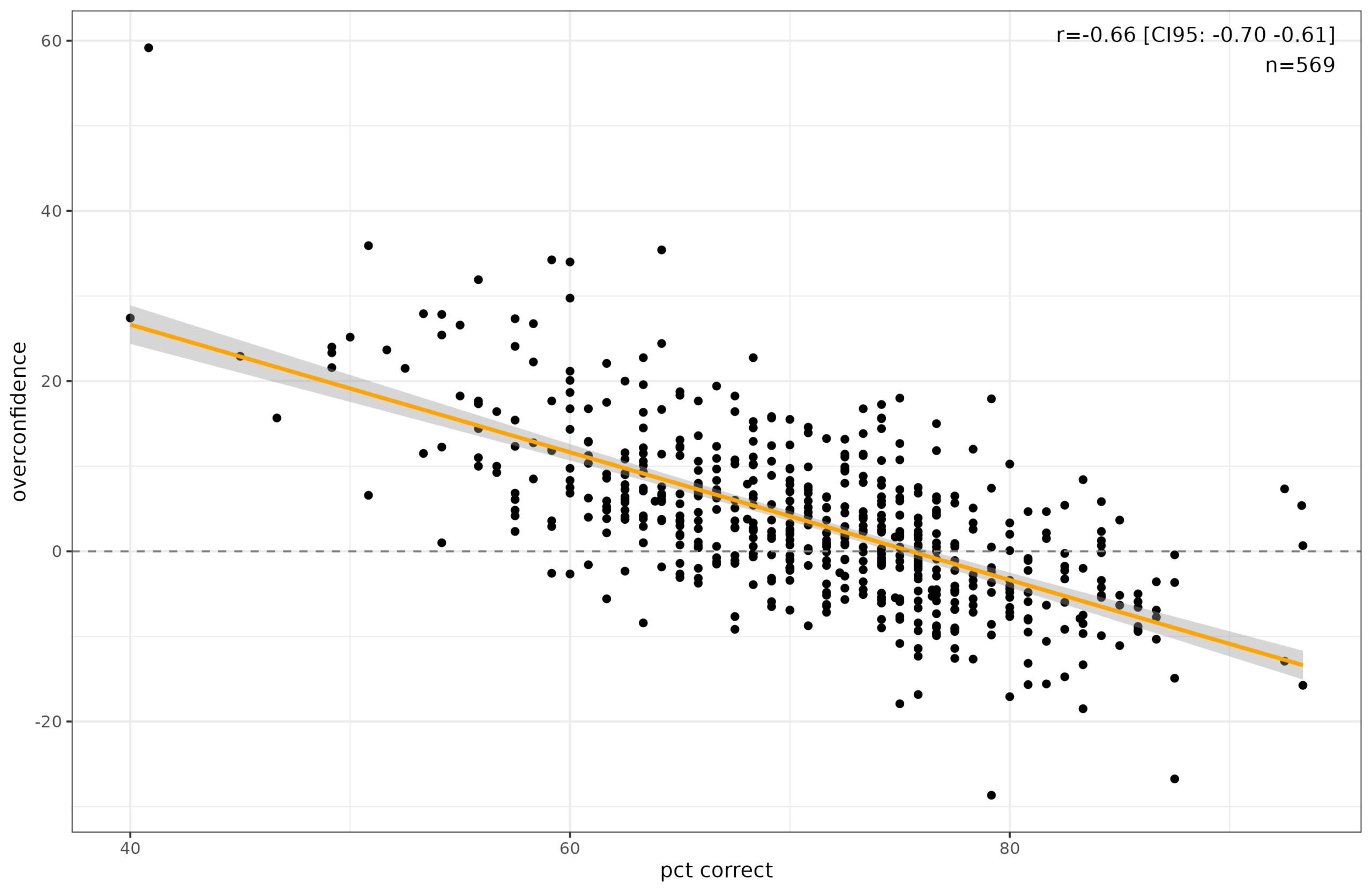 - Overconfidence is the difference between the two above, that is, if your confidence levels implied you got 100 correct but you only got 90, the score is 100-90 = 10. You were overconfident by 10 questions in aggregate.