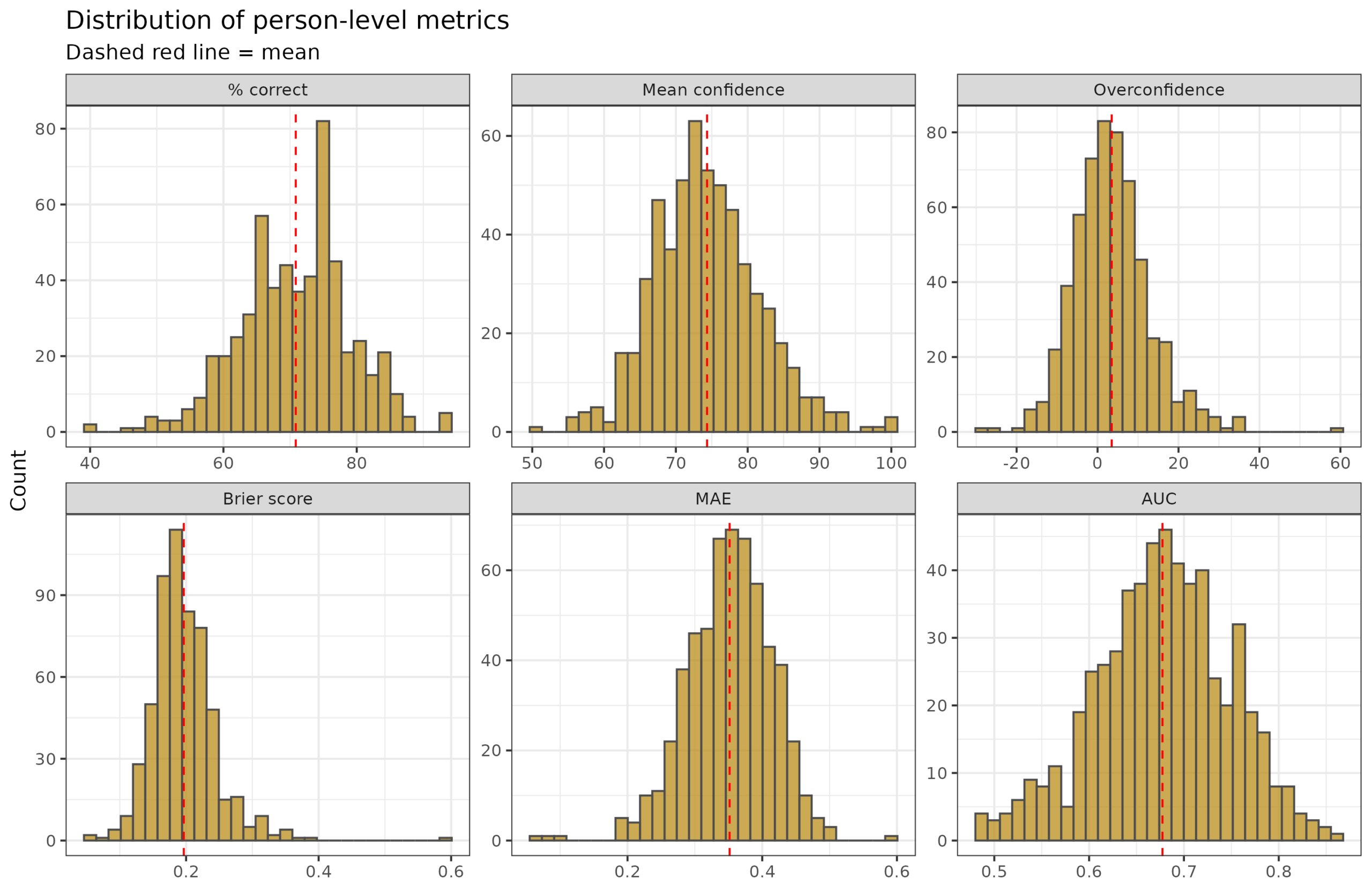 - Mean confidence is the average confidence given for the chosen answer. For perfectly calibrated people, this value is the same as their % correct.